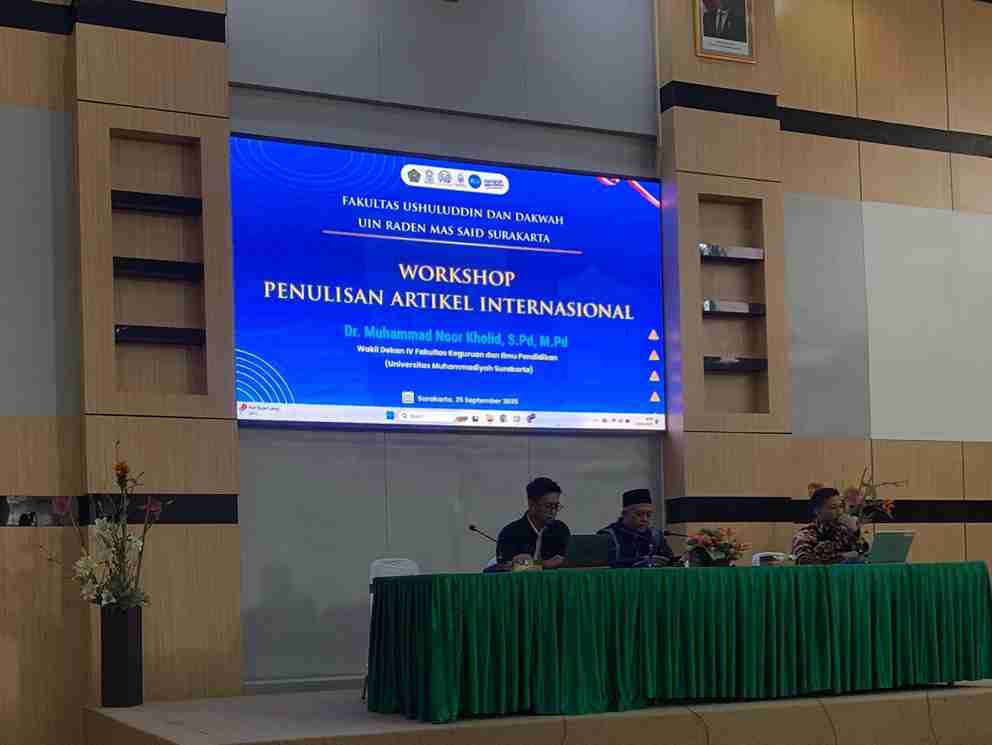 Surakarta, 25 September 2025 – Fakultas Ushuluddin dan Dakwah (FUD) UIN Raden Mas Said Surakarta kembali menunjukkan komitmennya dalam meningkatkan kapasitas akademik sivitasnya dengan menyelenggarakan Workshop Penulisan Artikel Ilmiah Internasional. Kegiatan ini berlangsung di Aula Rektorat UIN Raden Mas Said Surakarta dengan menghadirkan narasumber Dr. Muhammad Noor Kholid, S.Pd., M.Pd., (Wakil Dekan IV Fakultas Keguruan dan Ilmu Pengetahuan Universitas Muhammadiyah Surakarta) serta dipandu moderator Akhmad Anwar Dani, S.Sos.I., M.Sos.I.. ( Dosen Fakultas Ushuluddin dan Dakwah UIN Raden Mas Said Surakarta)